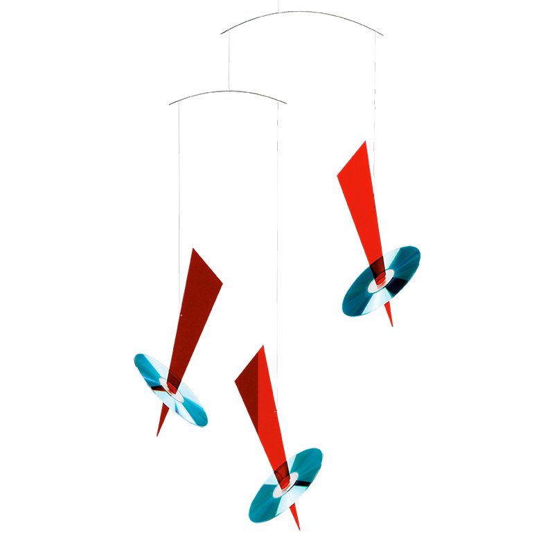 If you find it more interesting with the 3 triangels in red transluciv acryl take this model. Simply hang your used CD’ with the clear face up, and the mobile will catch the sunlight and send “butterflies” around on the walls in your room.